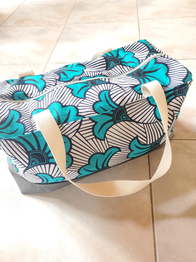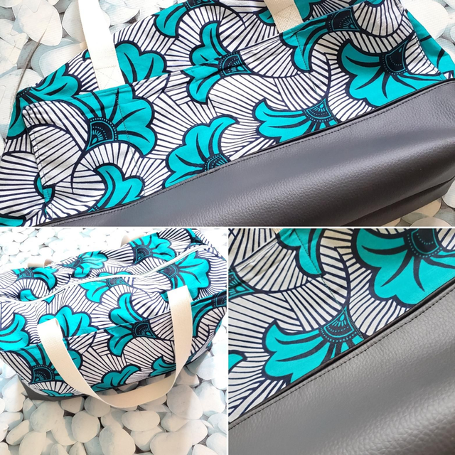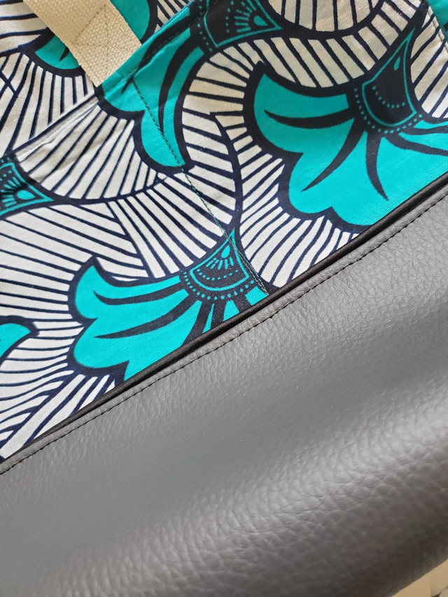 Simili cuir et tissu wax.